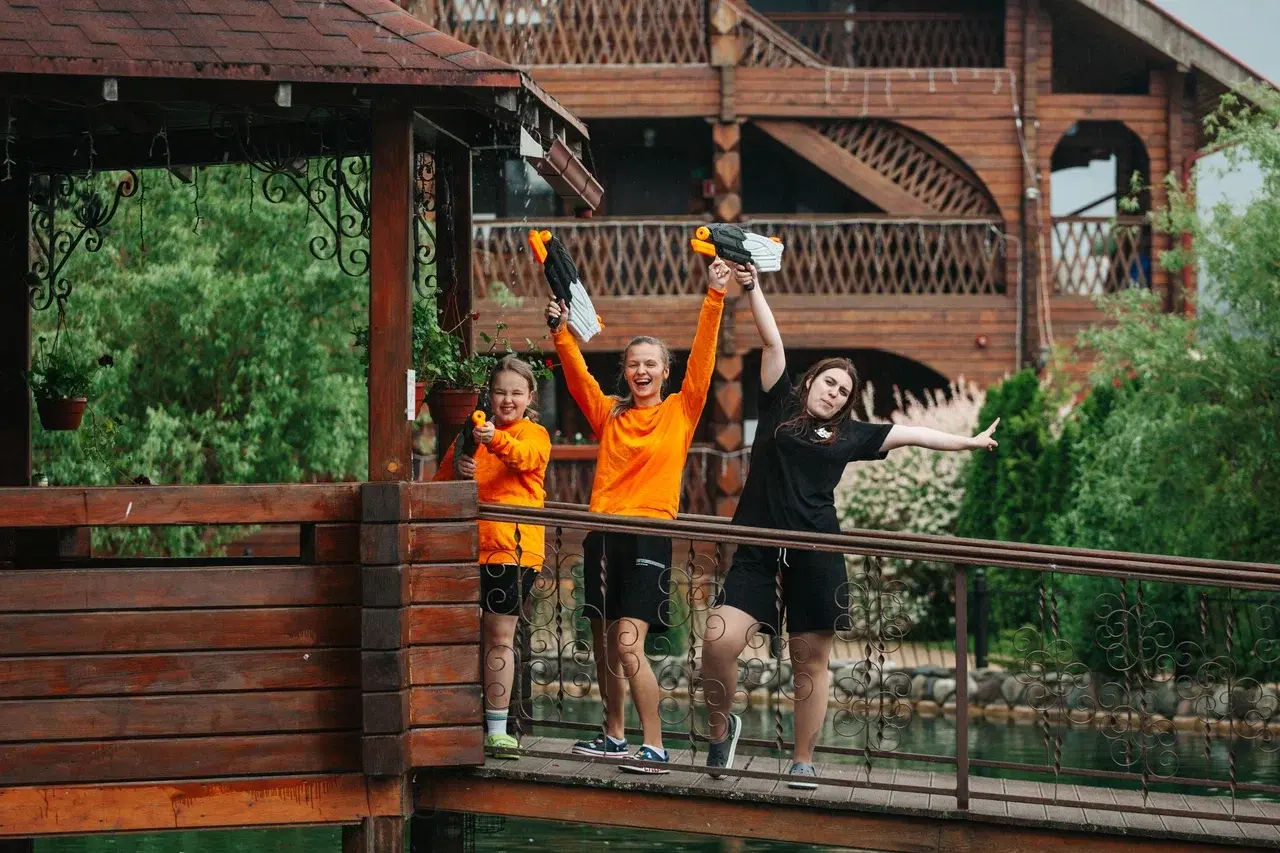На территории 2 детские площадки, батуты, детская игровая комната — маленькие гости будут в восторге.