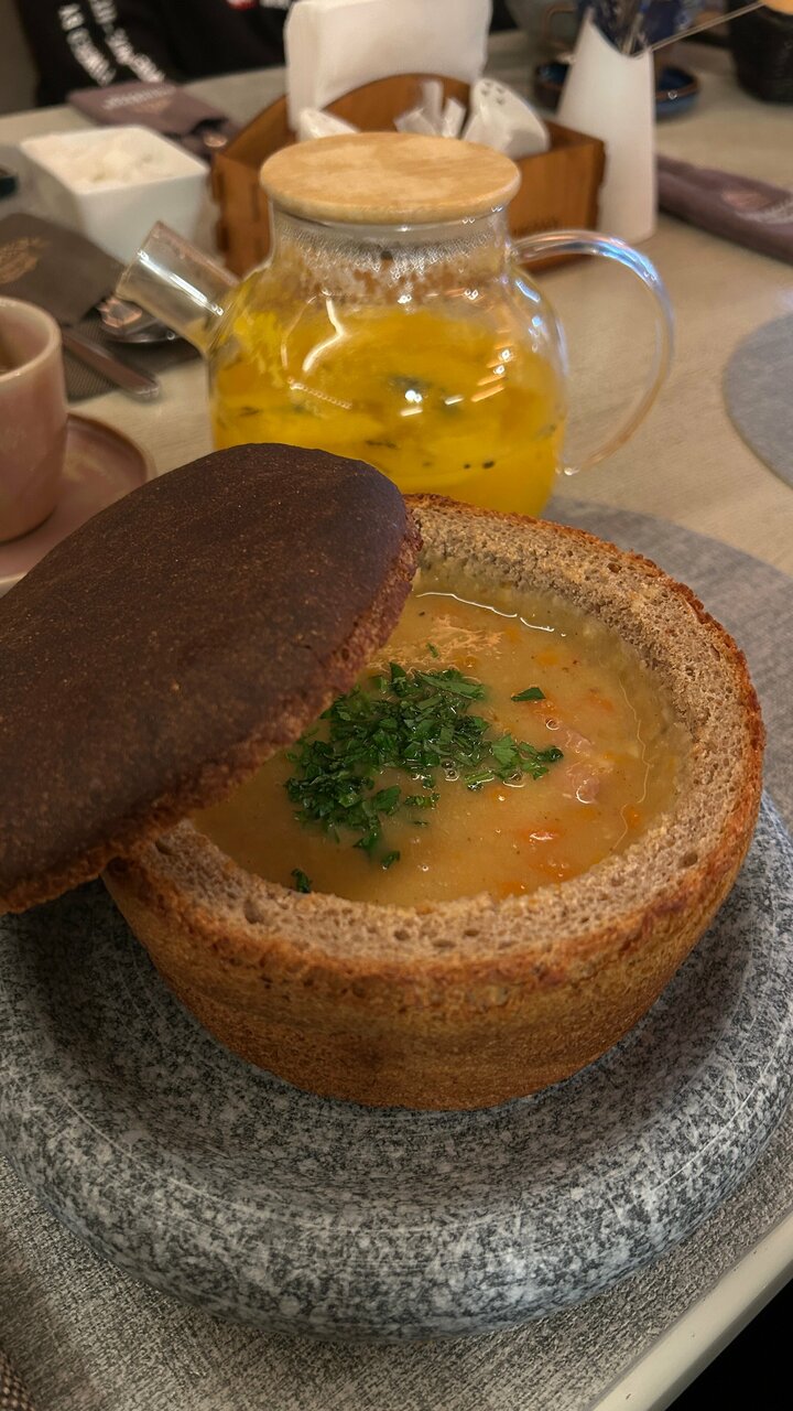 Были в ресторане, отличное место. Все очень вкусно, аккуратно, красиво и быстро. Изюминка - гороховый суп в хлебе