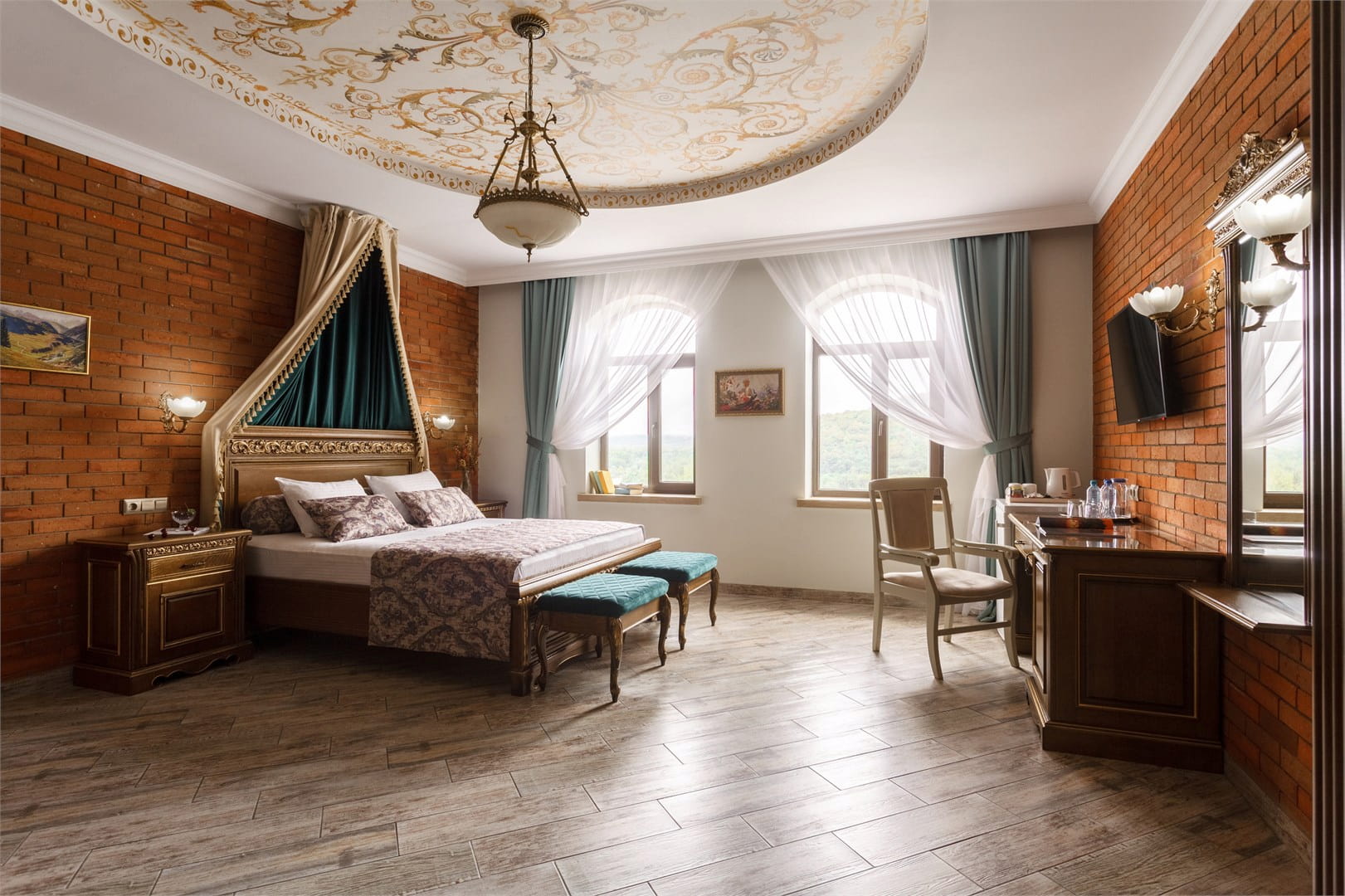 Номер оборудован мебелью из массива, оснащен двухспальной кроватью размером king-size и двухъярусной кроватью. На двухъярусной кровати могут разместиться взрослый и ребенок или 2 детей. Теплые полы в комнате и санузле. Из окна открывается потрясающий вид на Большой Кавказский хребет и реку Белая.